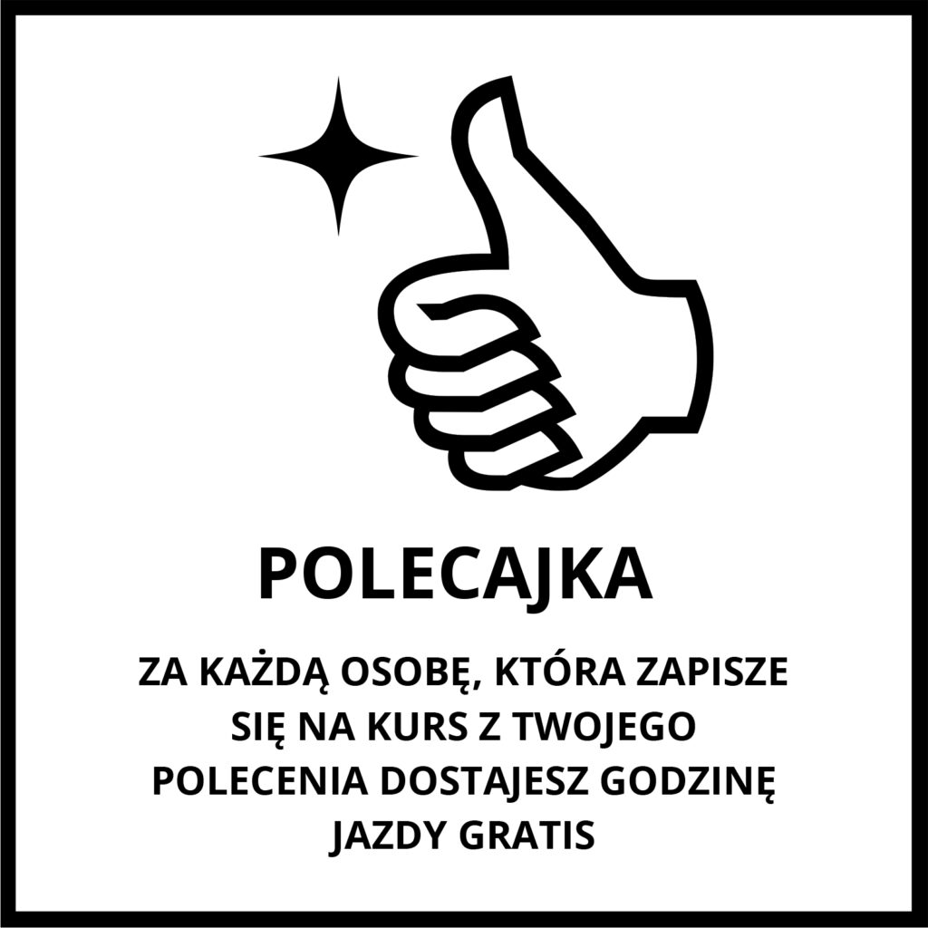 - Polecajka – za każdą osobę, która zapisze się na kurs z Twojego polecenia dostajesz dodatkową godzinę jazdy gratis