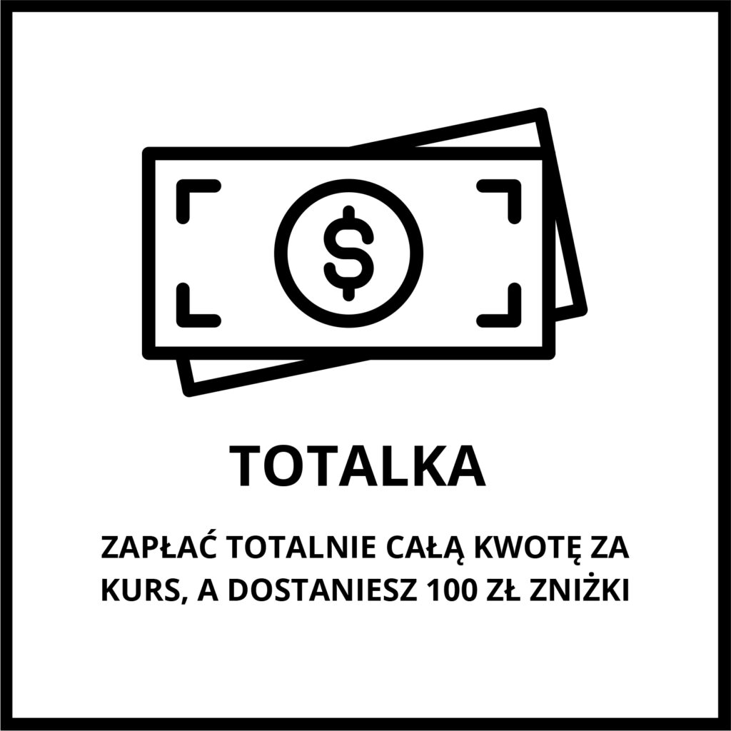 - Totalka – jeśli zapłacisz totalnie całą kwotę za kurs dostajesz 100 zł zniżki